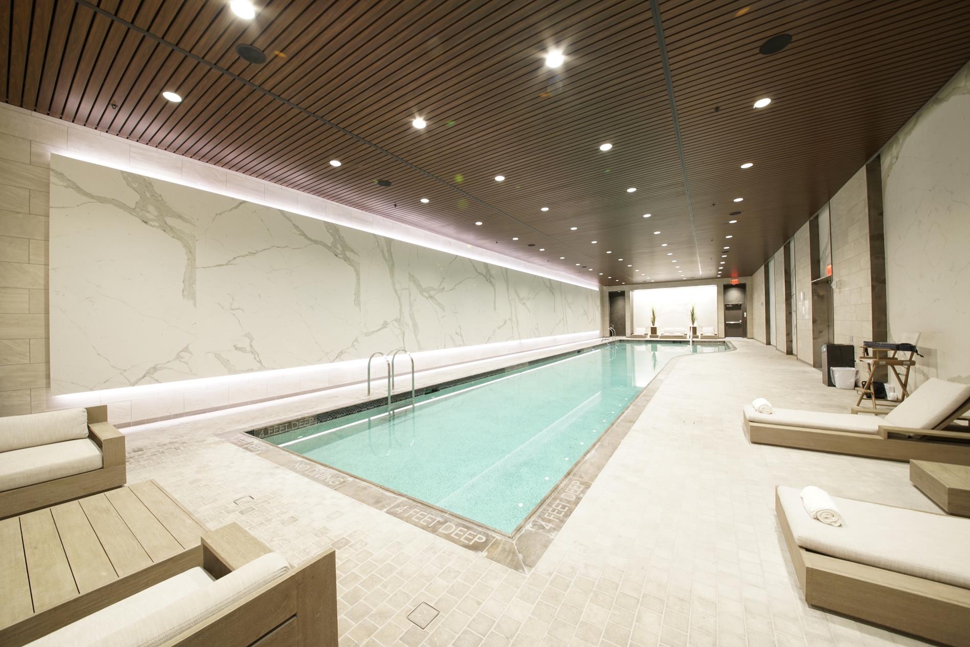 The palatial primary en-suite bedroom is elegantly designed with generous closet space including a walk-in - closet and also includes beautifully designed drapes and tailored lighting. The ensuite windowed spa-like bathroom features a walnut vanity with polished white nano glass walls, radiant heated floors, free standing 6' tub, separate glass enclosed shower and a glass enclosed toto with bidet WC.
